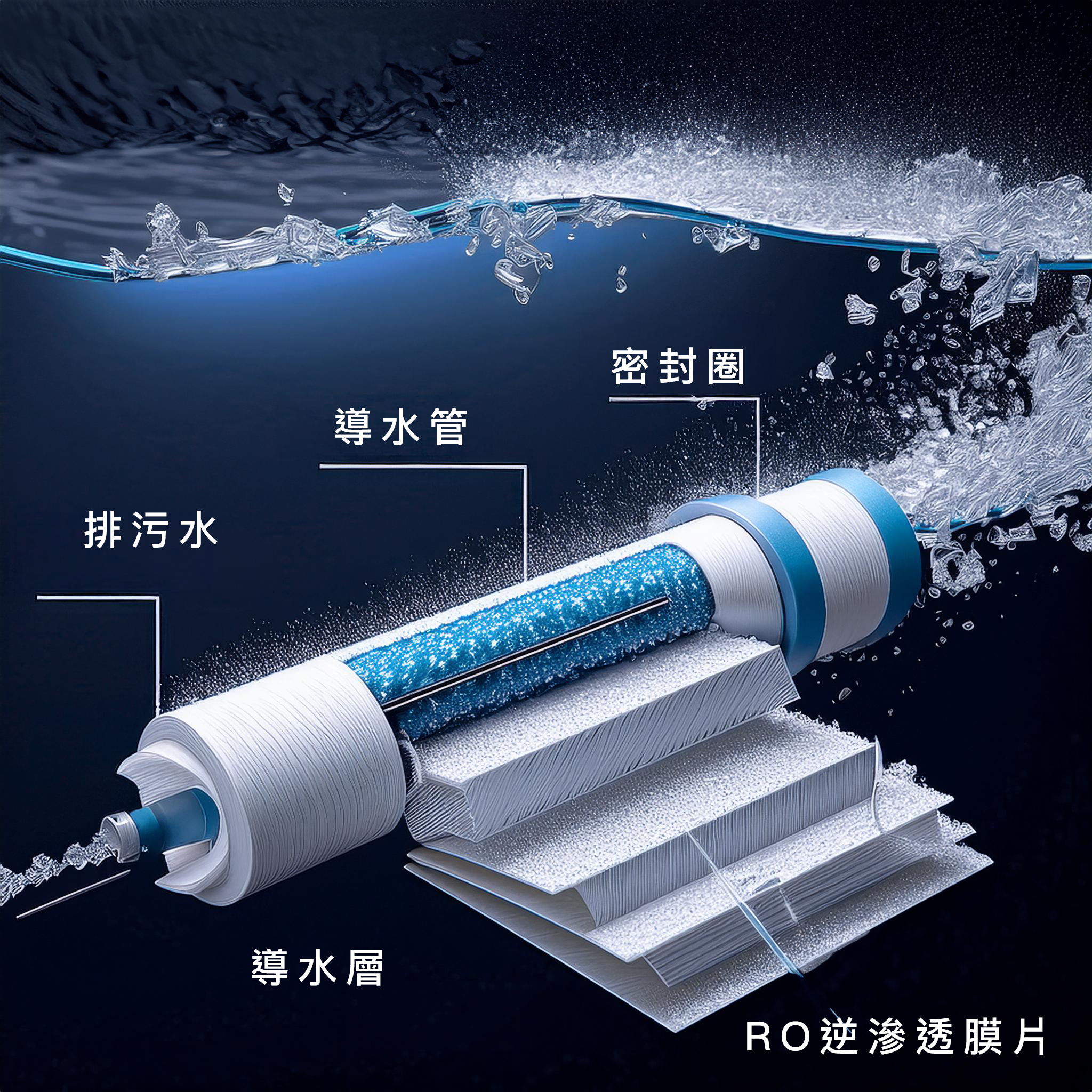 最上面一層Polyamide layer是很薄的一層名字叫聚酰胺薄膜,薄膜厚度約0.2微米。中間放上一層原水導流網,將模對折,原水沿導流網流動,幾層膜疊加起來,每層膜之間放一層純水收集網,在原水的一側加壓,水分子透過膜出水變成純水,因為三面被密封,於是純水被收集網導流到中間集水管,將膜圍繞集水管卷起,因此水是沿著螺旋的方向進入集水管,從這個集水管流出的水就是純水,而水中較大的顆粒灰塵泥沙細菌病毒重金屬則不能通過就將廢水排出。