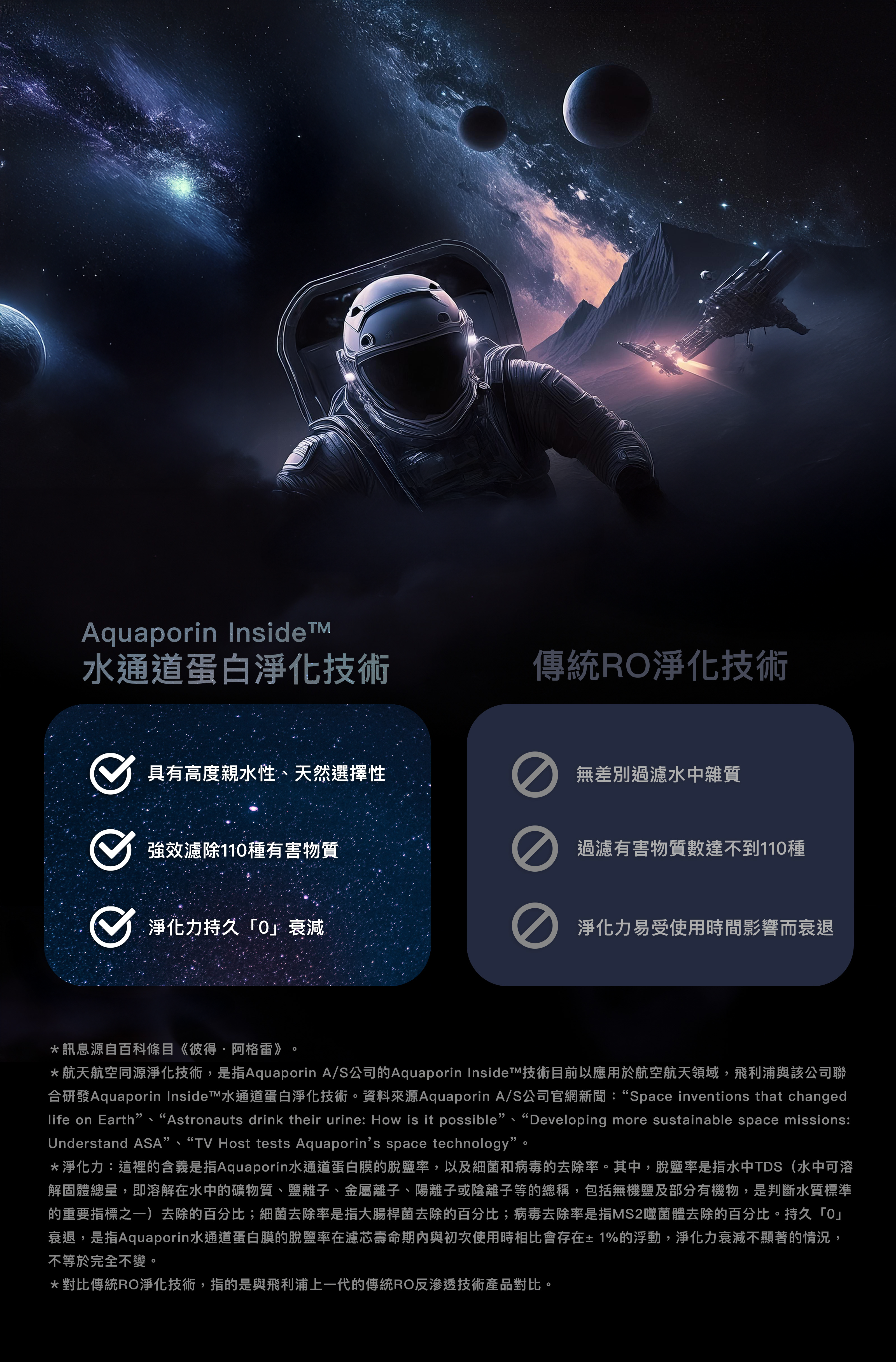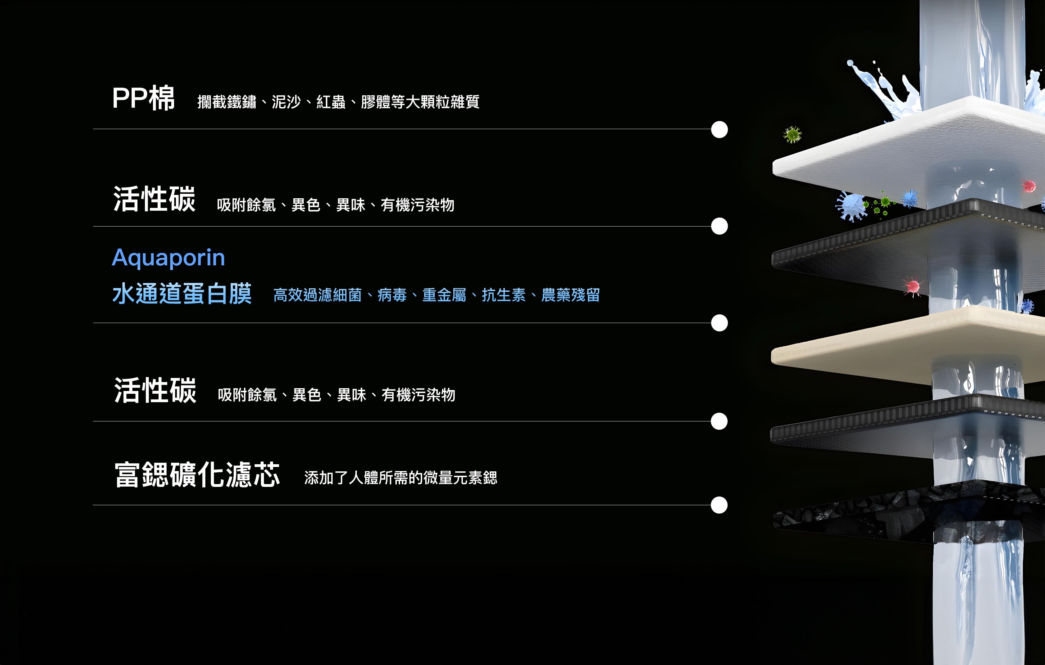搭载 Aquaporin Inside 水通道蛋白净化技術 , 有效過濾原水中的重金屬物質 有機物、膠体、细菌、餘氯等雜質