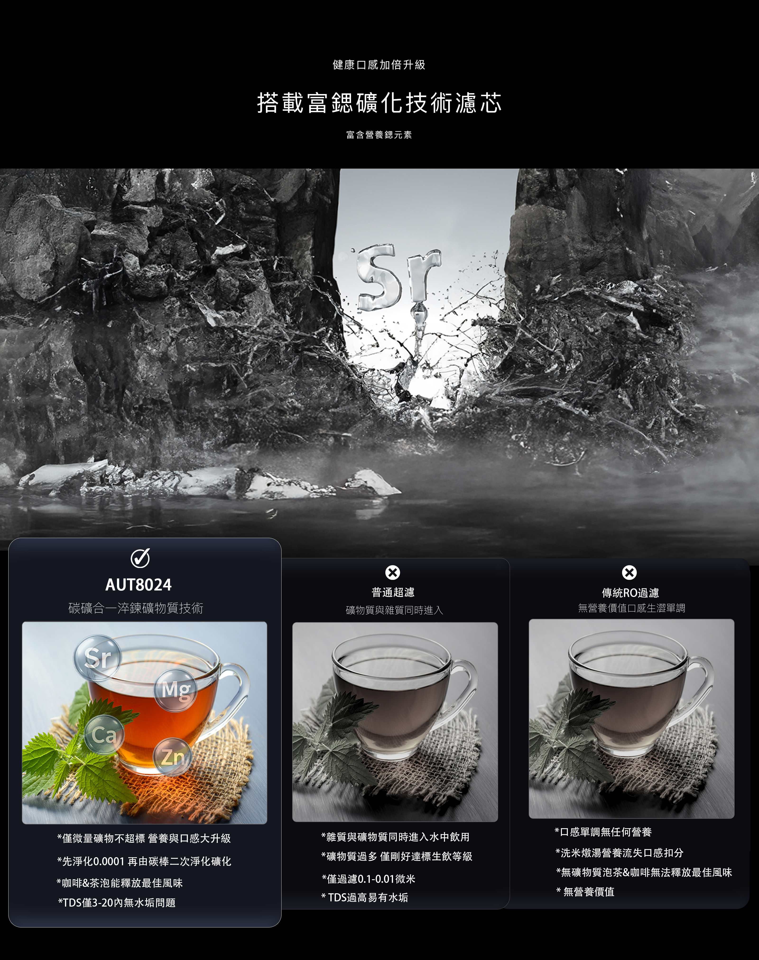 阻攔吸附水中異味揮發物,如氯、苯、甲醛、藻氣,雙層碳棒及淬煉礦石讓單調RO水充滿營養,口感與營養雙升級