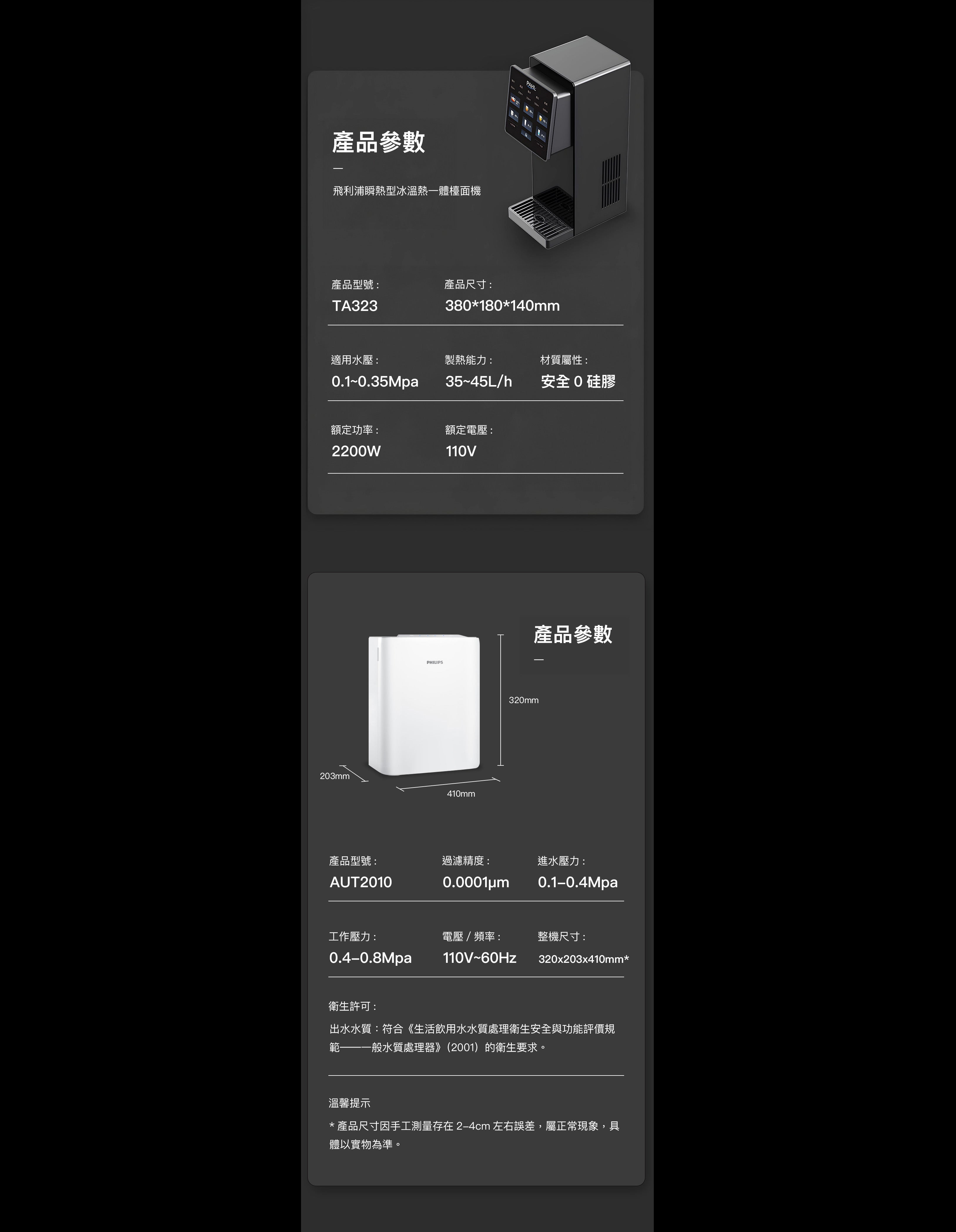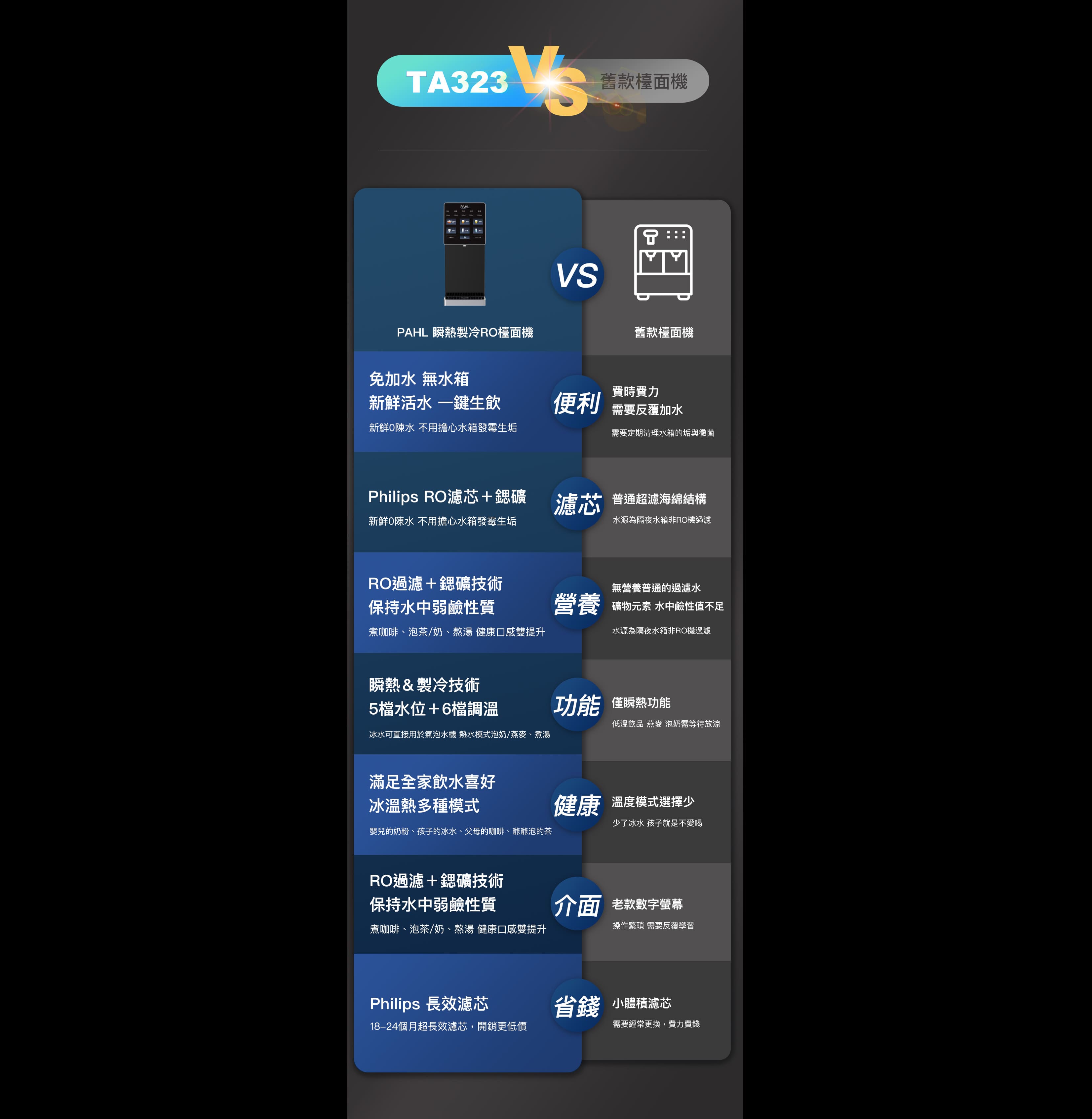 TA323 是PAHL首款搭載瞬熱型冰溫熱一體檯面機。TA323 不僅能夠搭配所有品牌的濾芯組,更標配Philips RO機,確保水質純淨。