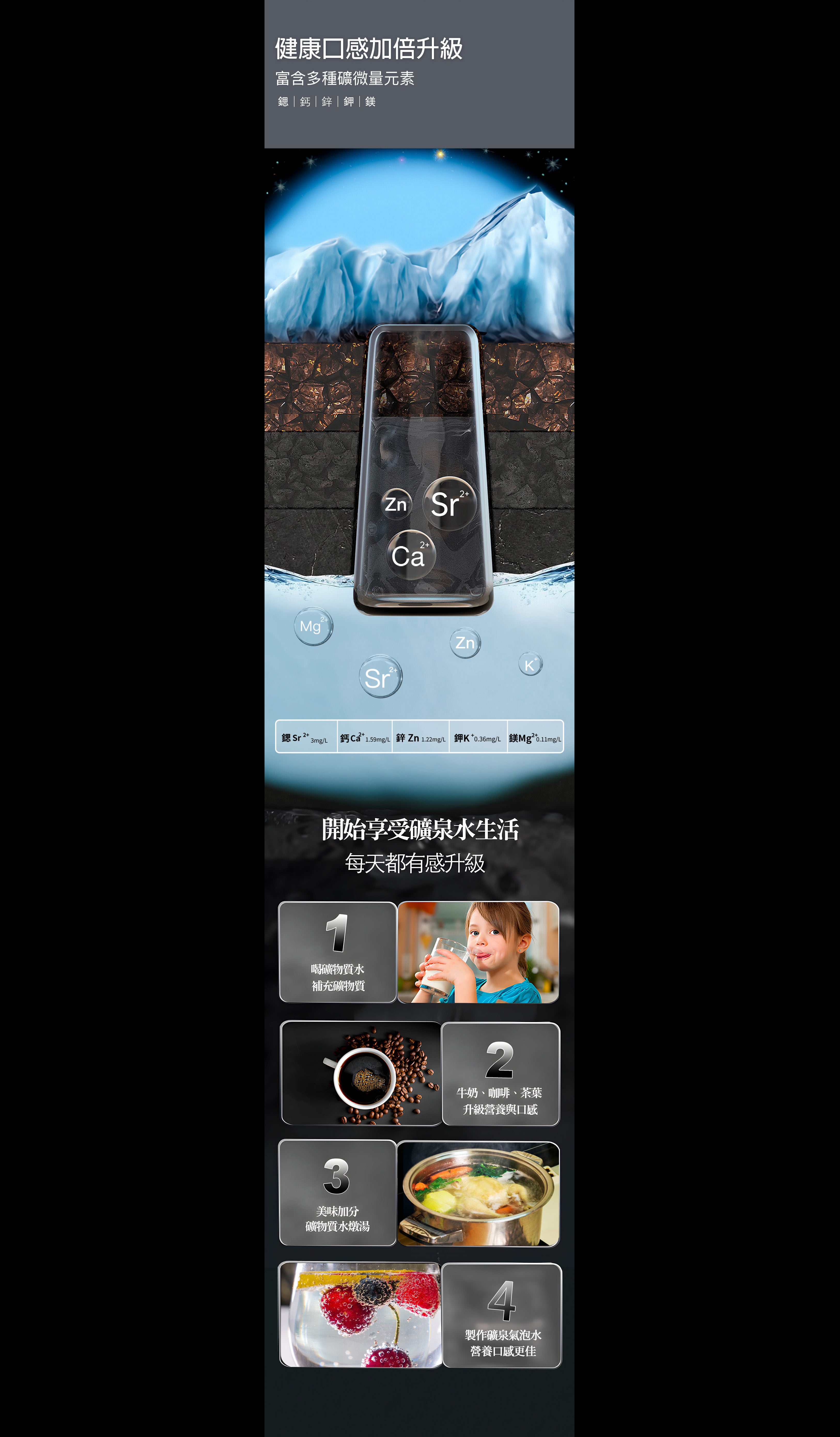 多重天然岩石、礦化技術將RO水成礦物質水、增加水中鍶、偏硅酸、硒、鈣、鎂、鋅等人體有益礦物質元素