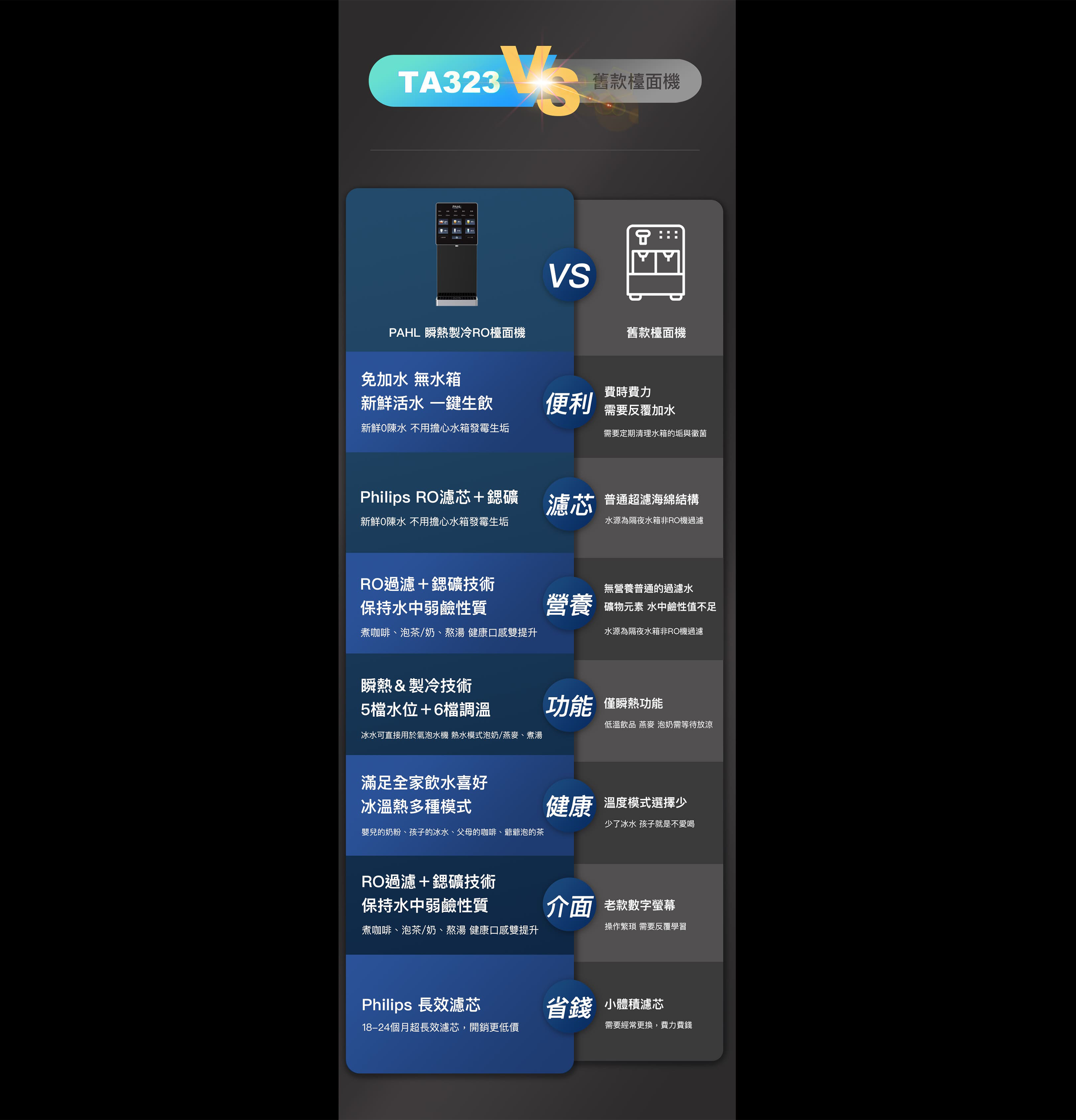 TA323 是PAHL首款搭載瞬熱型冰溫熱一體檯面機。TA323 不僅能夠搭配所有品牌的濾芯組,更標配Philips RO機,確保水質純淨。