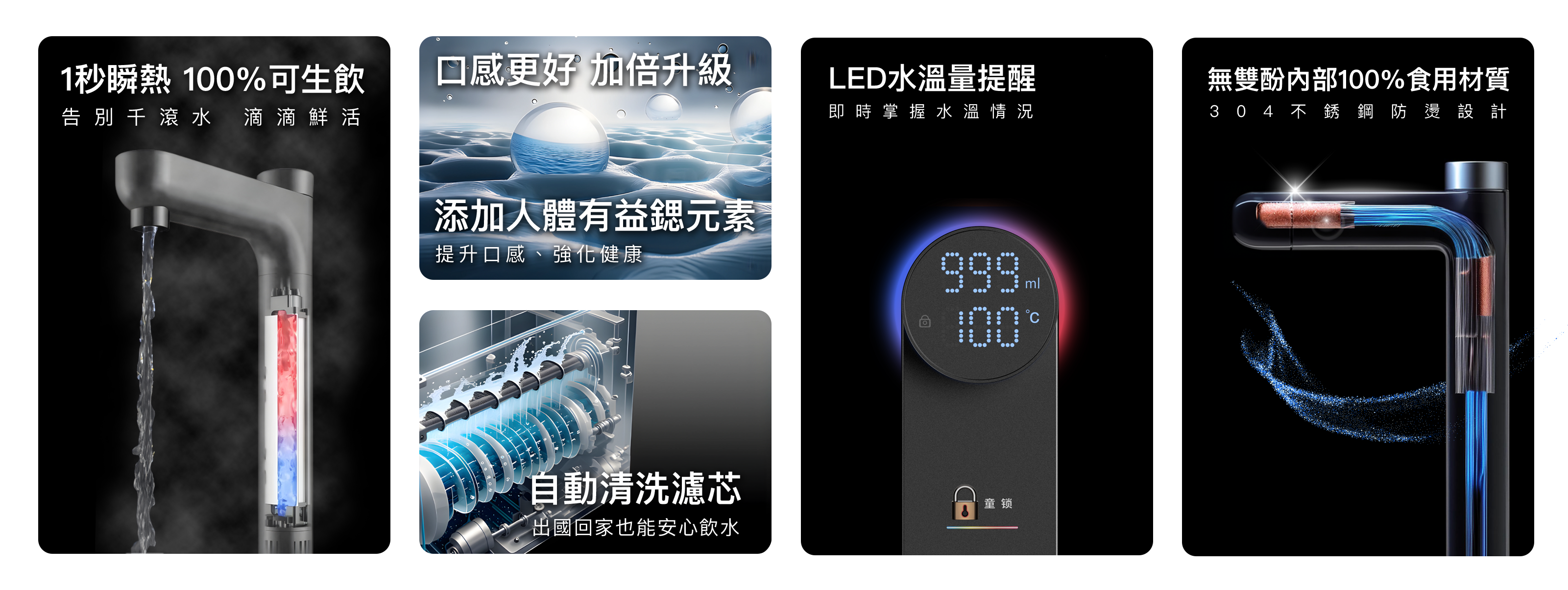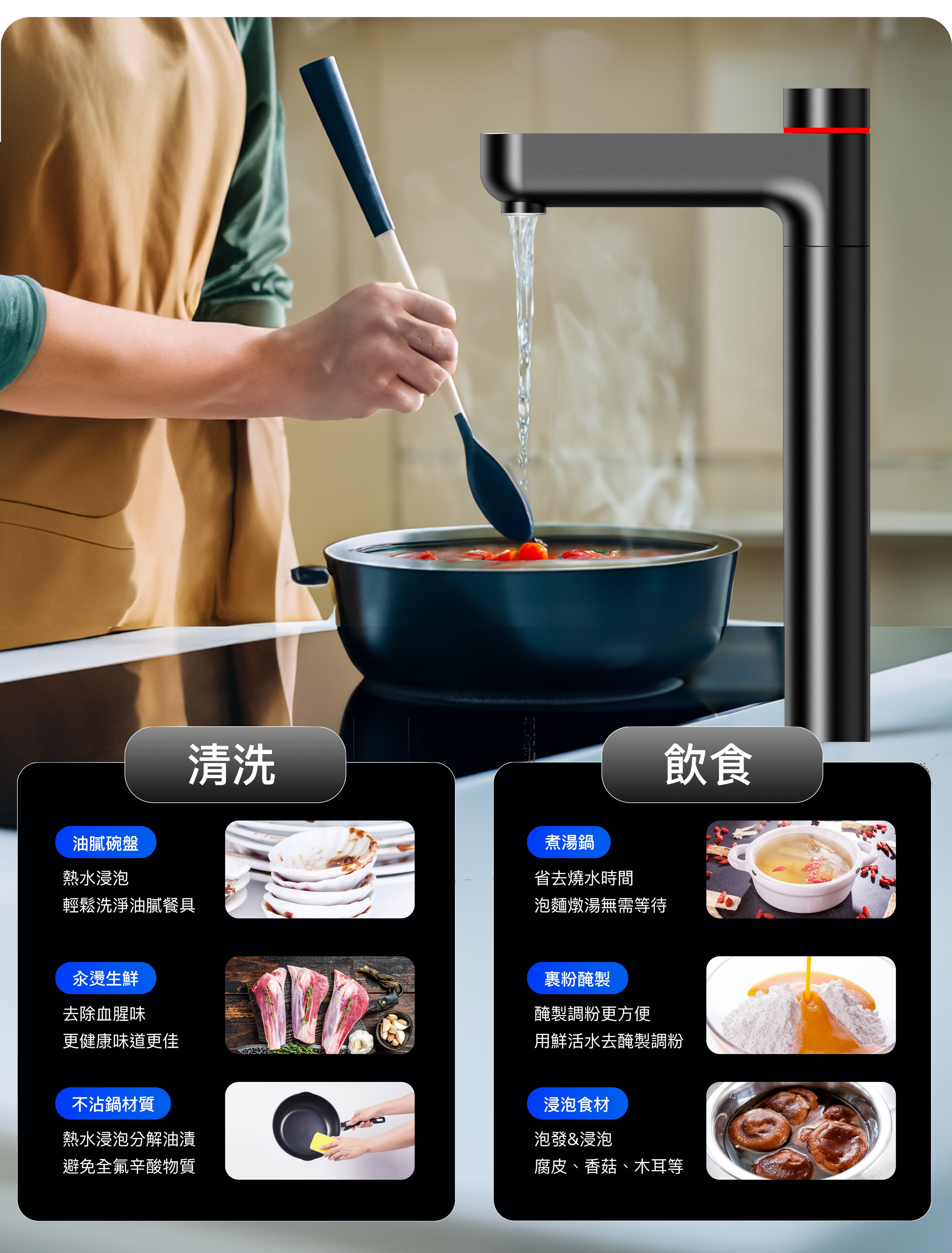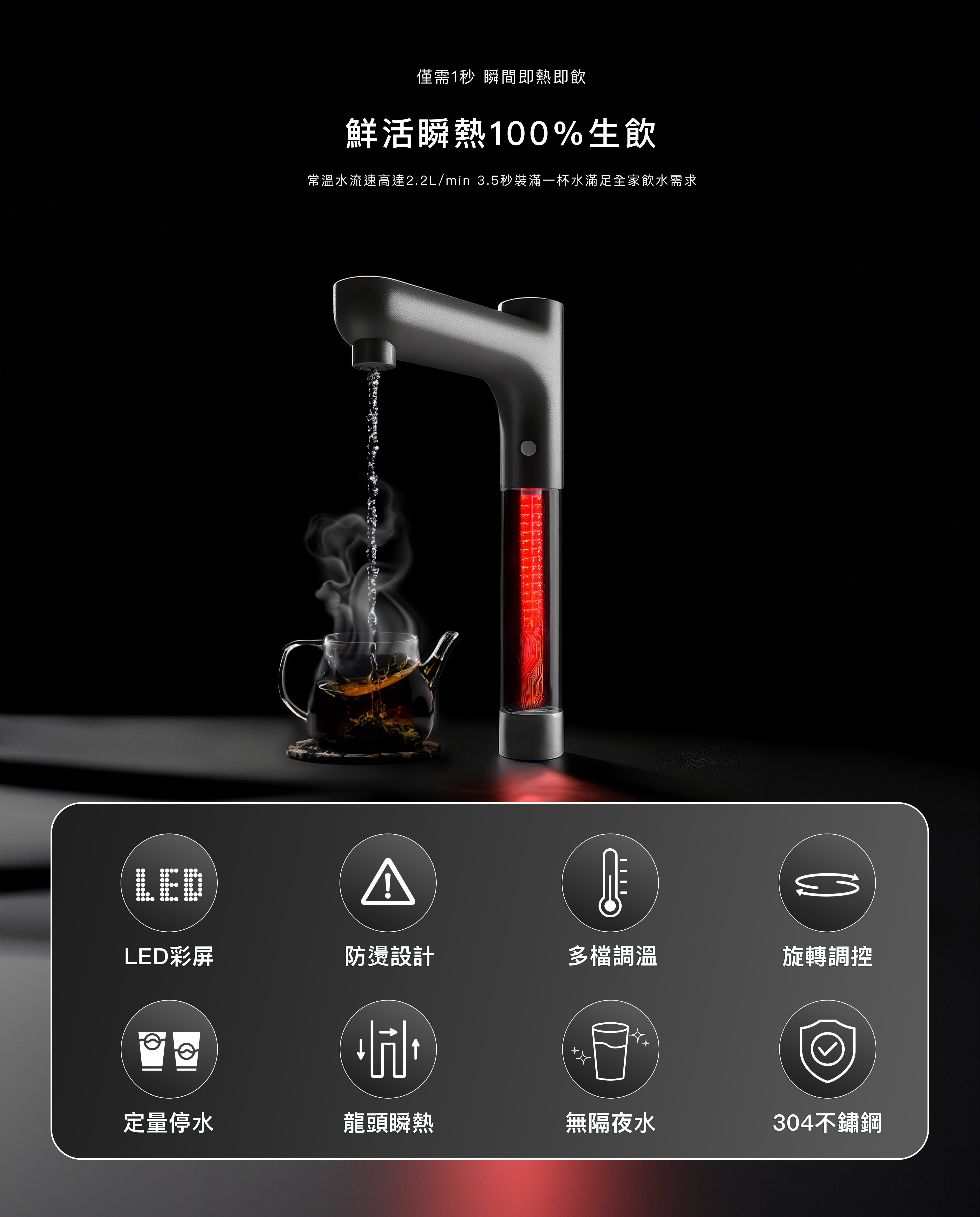 - 🚿 龍頭瞬熱技術:無需再擔心千滾水,讓每一滴水都鮮活可飲!