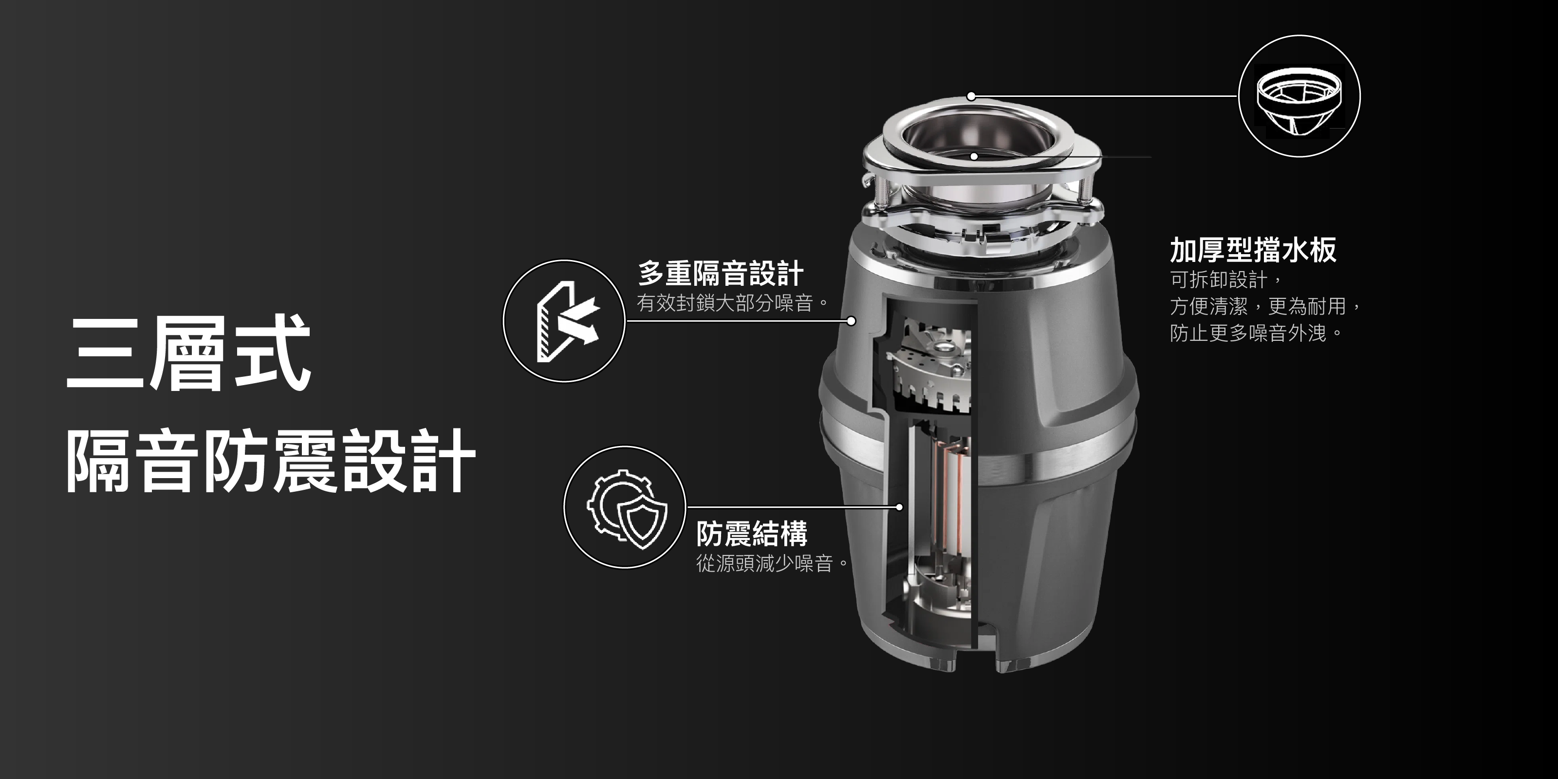 運作效能出色,卻有著極低的操作噪音。這得益於獨特的靜音設計:領水槽擋板不僅確保了排水效果,在水槽出水口處形成了微型水壩,達到隔音效果。防震支架配備橡膠墊片,有效隔絕了處理機與水槽間的噪音傳遞,讓廚房保持寧靜。