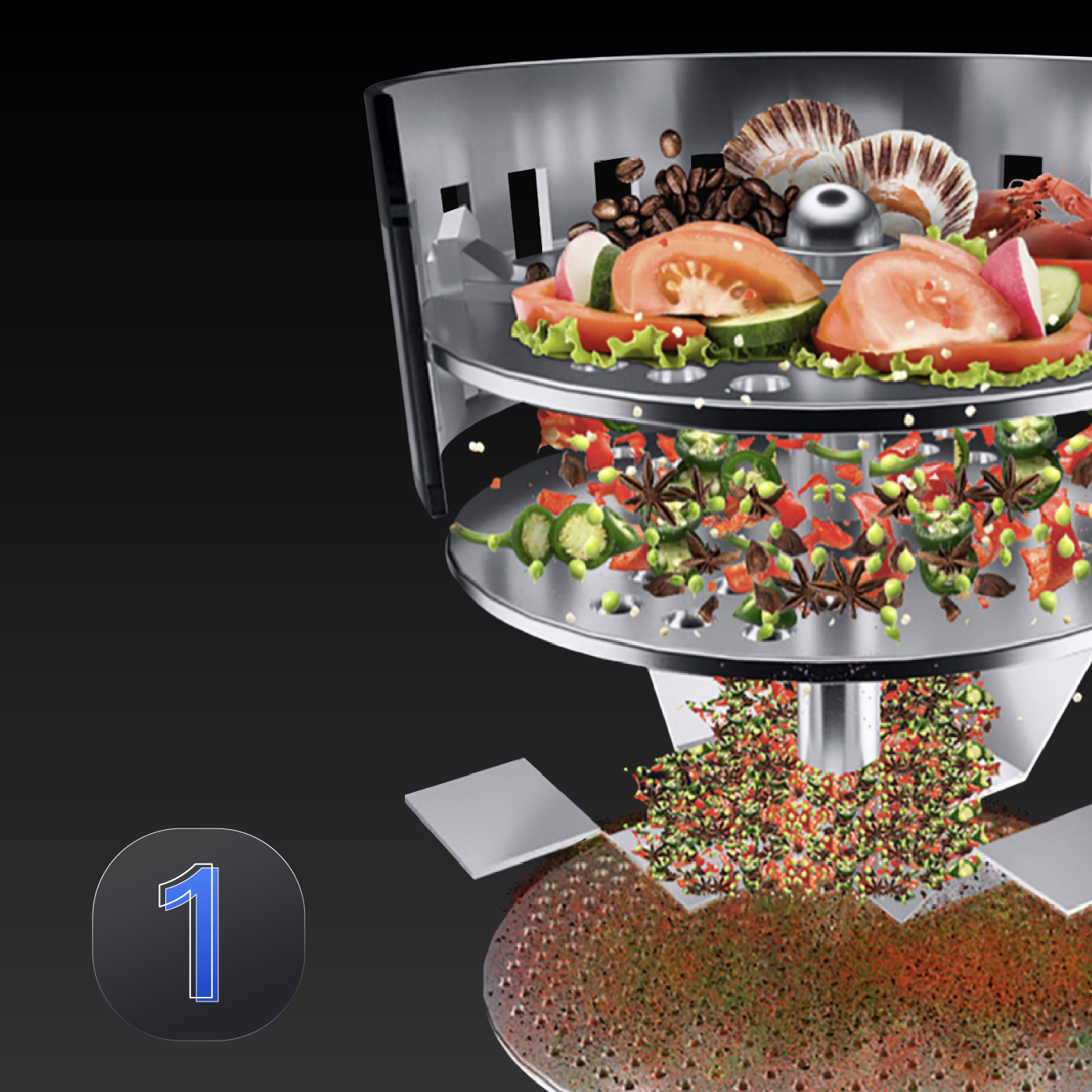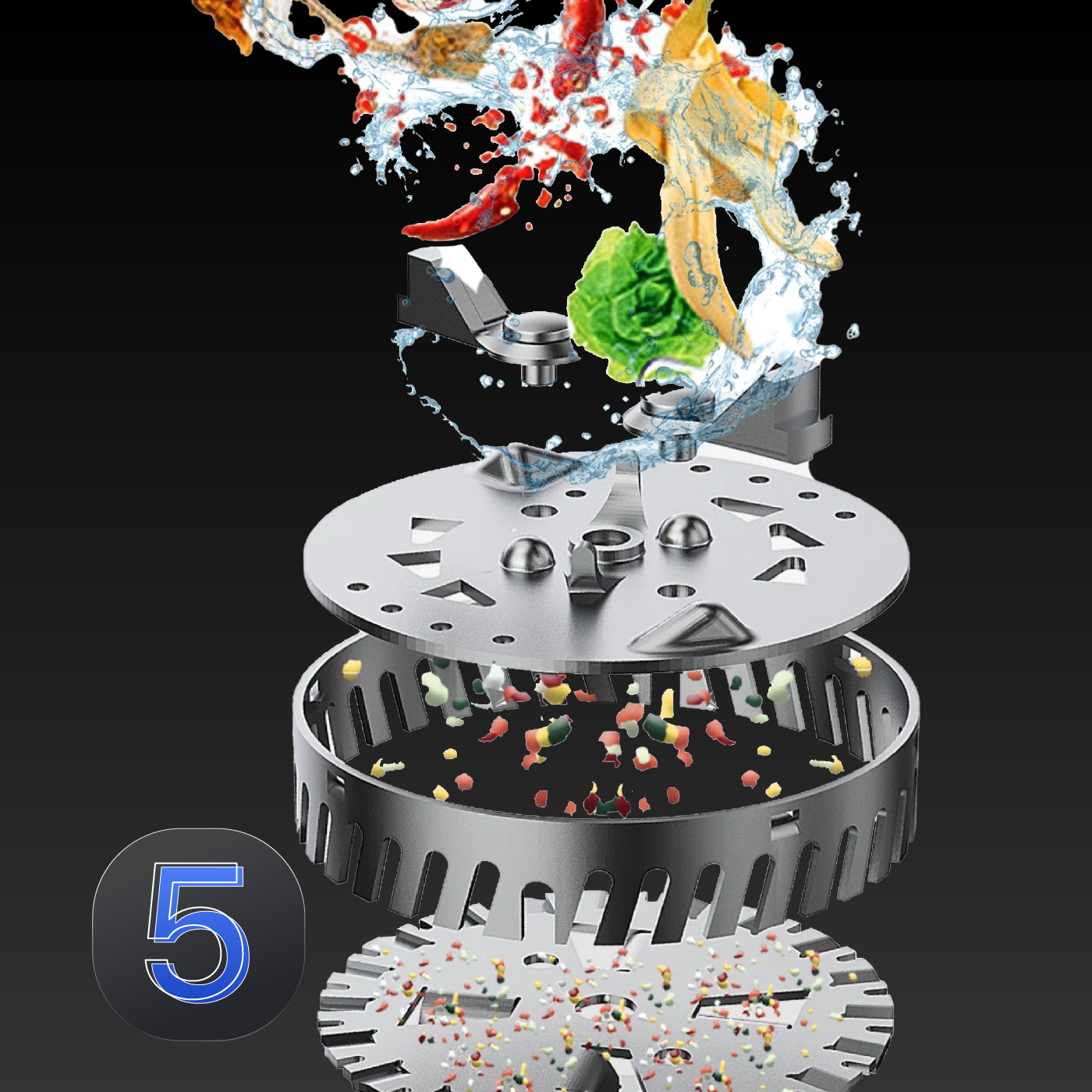 鎚擊粉碎➔研磨粉碎➔離心迴旋➔交錯砍割+三層切刀層研磨 為七層研磨系統 可加快廚餘處理時間