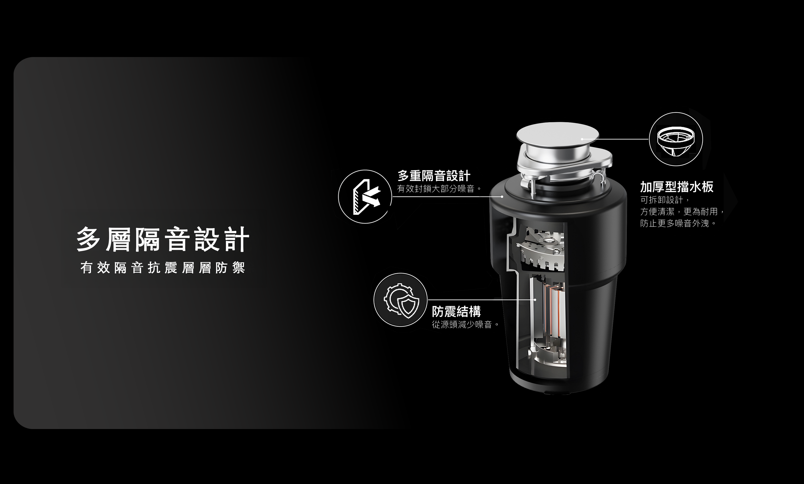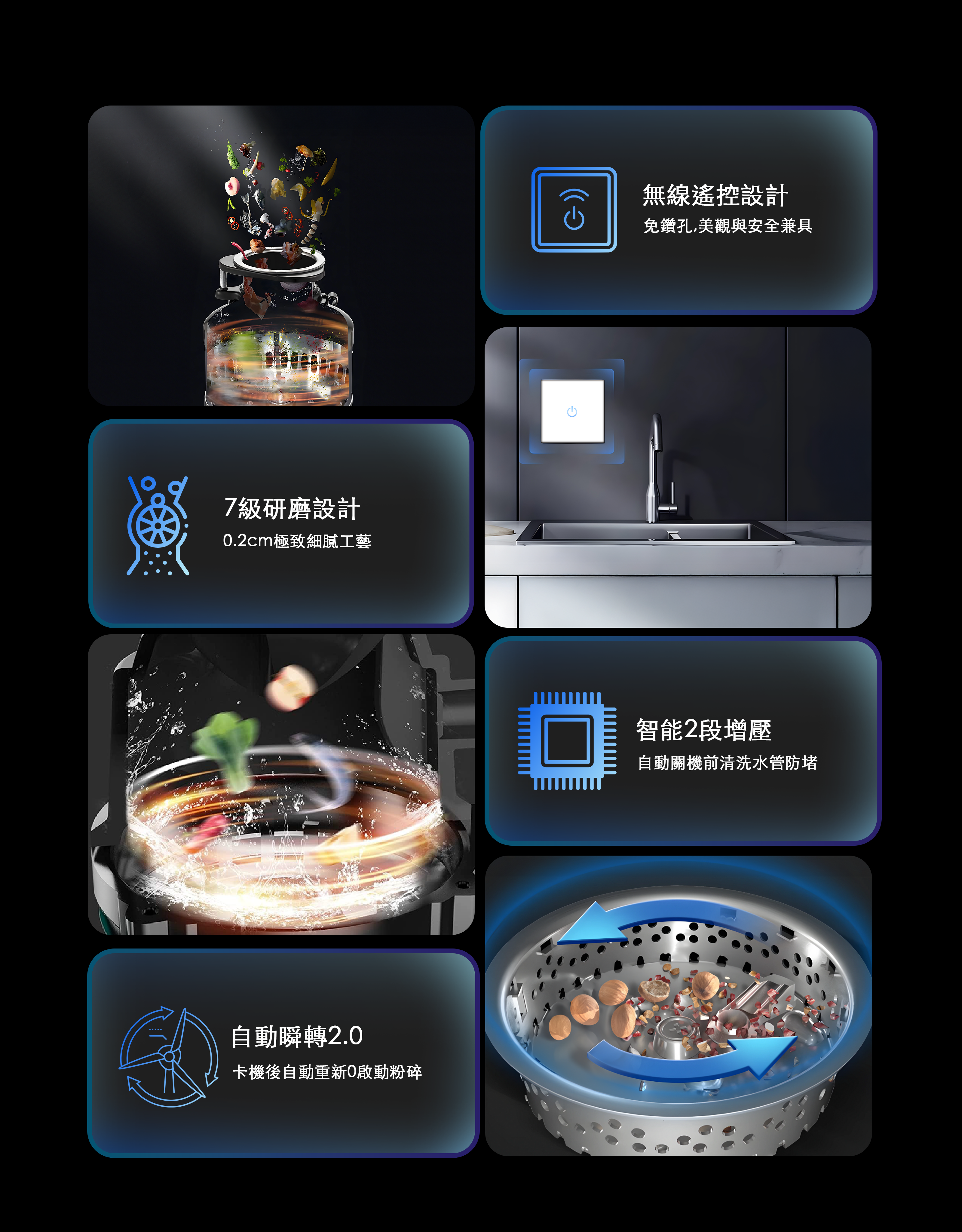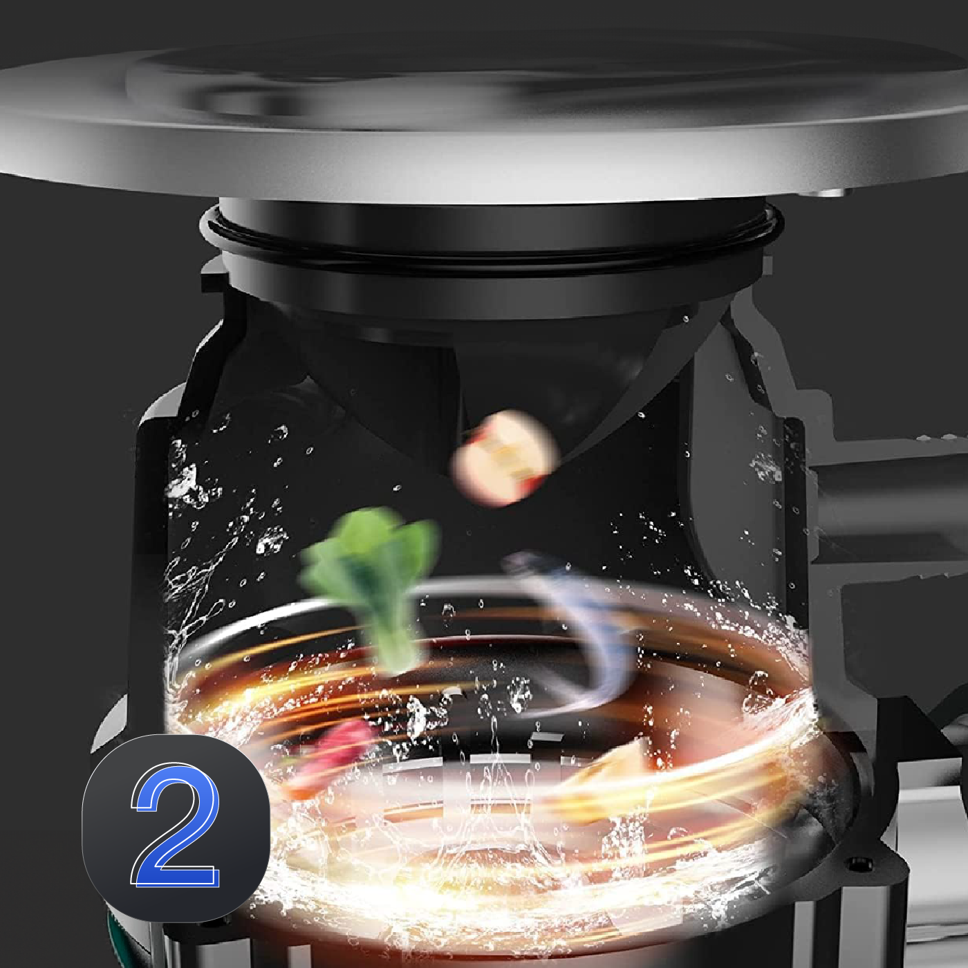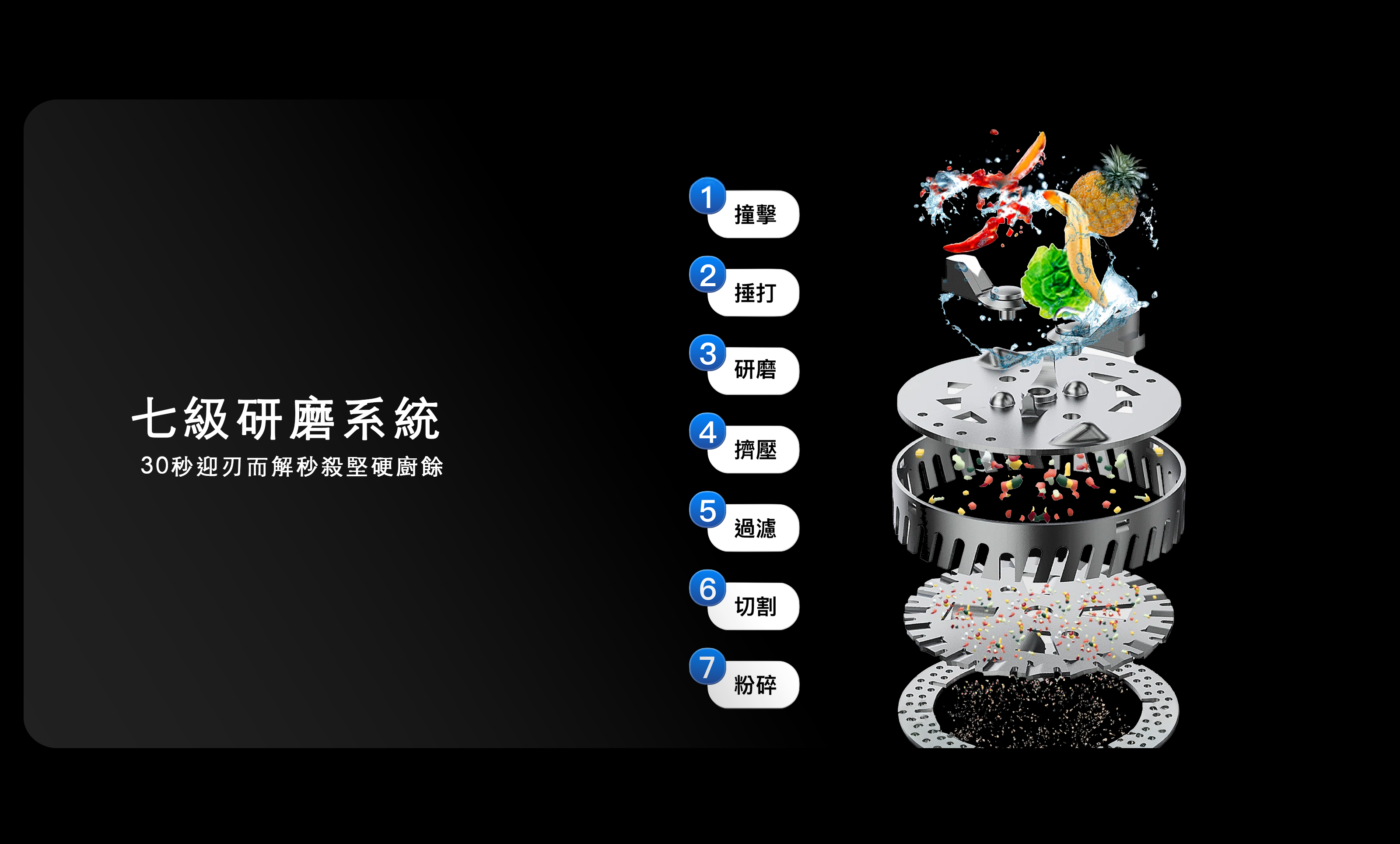 鎚擊粉碎➔研磨粉碎➔離心迴旋➔交錯砍割+三層切刀層研磨 為七層研磨系統 可加快廚餘處理時間